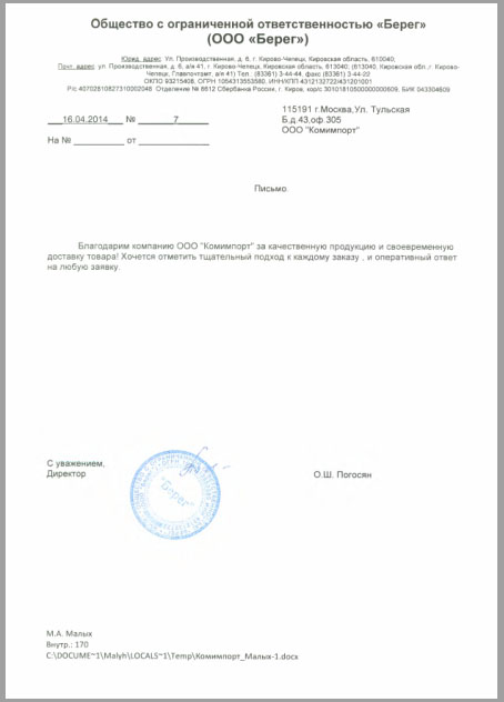 Настоящим письмом выражаем благодарность компании ООО «Комимпорт» за своевременное соблюдение сроков поставки запчастей, обладающих большим опытом и высоким профессионализмом в своей области. Особенно хотелось бы отметить высокое качество запчастей, которое на протяжении всего периода эксплуатации зарекомендовало себя с лучше стороны.