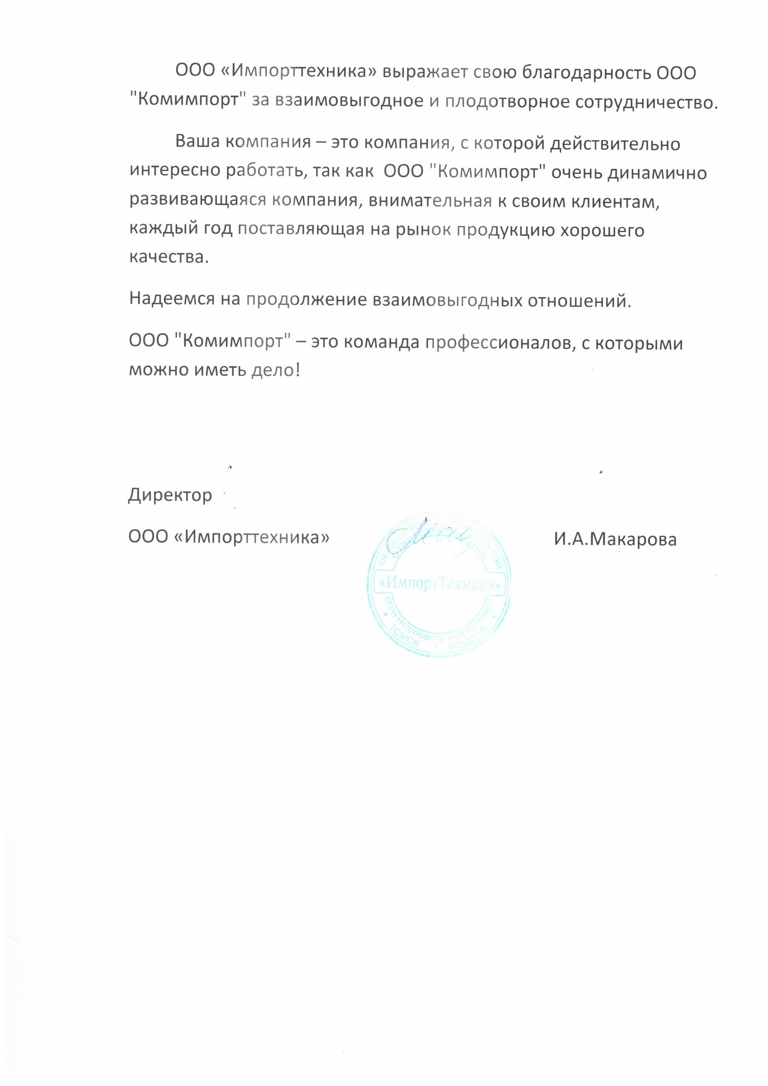 ООО «Импорттехника» выражает свою благодарность ООО «Комимпорт» за взаимовыгодное и плодотворное сотрудничество. Ваша компания – это компания, СС которой действительно интересно работать, так как ООО «Комимпорт» очень динамично развивающаяся компания, внимательная к своим клиентам, каждый год поставляющая на рынок продукцию хорошего качества. Надеемся на продолжение взаимовыгодных отношений. ООО «Комимпорт» – это команда профессионалов, с которыми можно иметь дело!