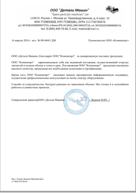 ООО «Детали Машин» благодарит ООО "Комимпорт" за своевременную поставку продукции. ООО "Комимпорт" зарекомендовало себя как надежный поставщик, осуществляющий отгрузку запчастей в полном объеме и точно в срок. Поставляемая ООО "Комимпорт" продукция неизменно высокого качества, прошедшая все необходимые испытания и сертификацию. Кроме того, ООО "Комимпорт" оказывает нашему предприятию информационную поддержку, осуществляя профессиональные консультации по всему спектру оборудования. Спасибо за сотрудничество, быструю реакцию на заявленные объемы. Мы готовы и в дальнейшем работать в совместных проектах.